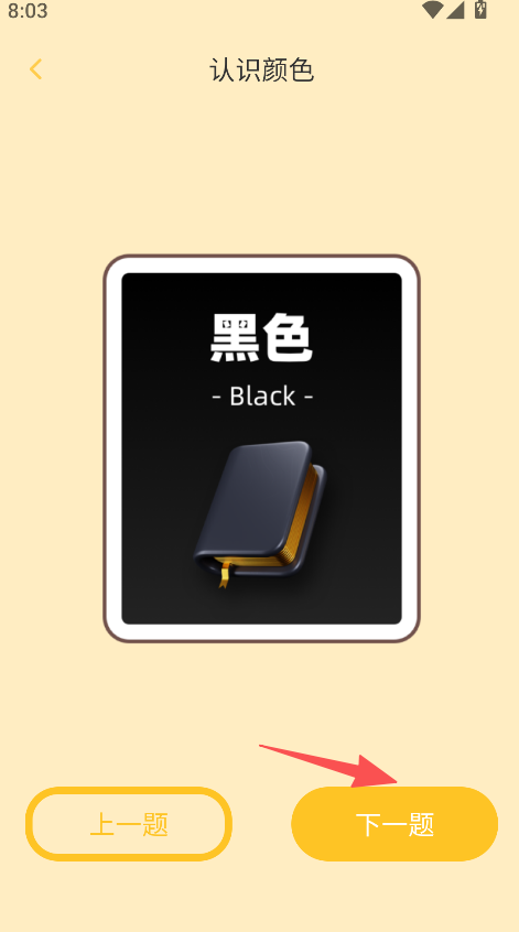 2、在认识颜色界面,点击下一题,学习不同颜色知识。