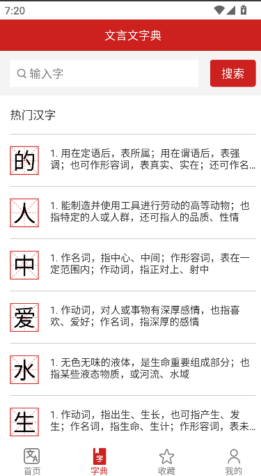 1、找到并点击底部导航栏中的“字典”功能入口,即可进入专门用于查询文言文字词的字典页面。