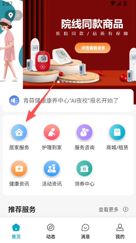1、打开软件,点击居家服务,进入服务选择界面。