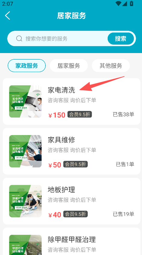 2、服务分类清晰,居家服务下细分家电清洗、家具维修等,用户可快速找到目标服务,选择针对性强。