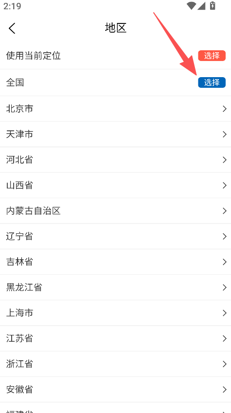 1、打开软件,进入地区选择界面,选择全国或具体省市。
