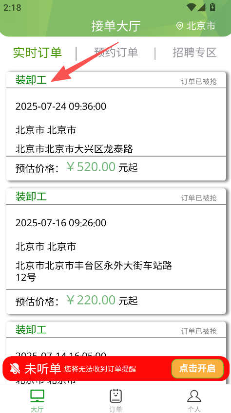 2、进入接单大厅,查看装卸工等实时订单的时间、地点及预估价格。