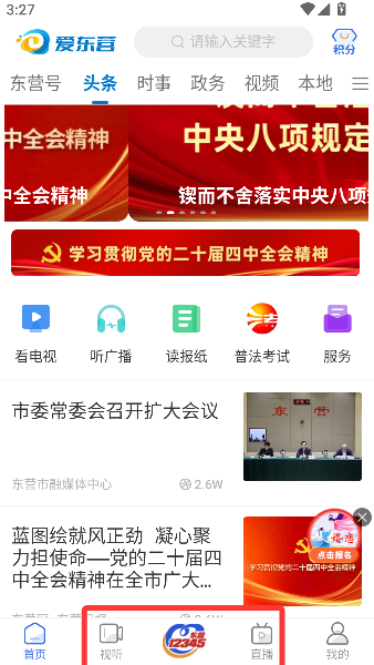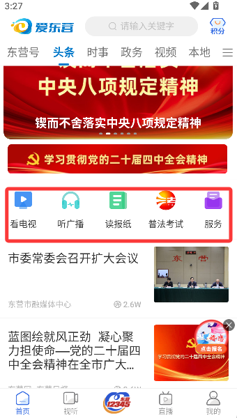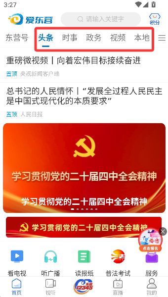 1、首页顶部像信息大餐的头盘,时事、政务、视频等板块整齐排列,静待挑选品尝。