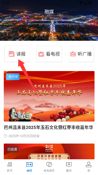 2、进入融媒页面后,选择"读报"功能按钮,即可浏览最新的本地电子版报纸内容。