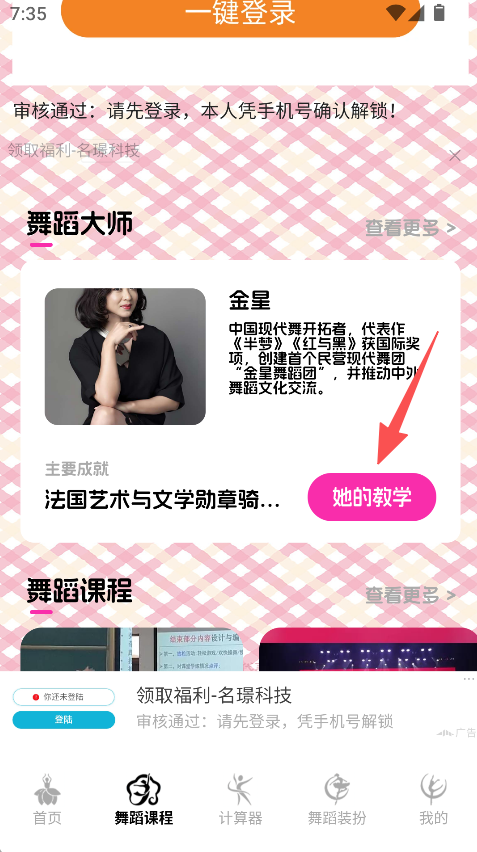 1、打开软件,进入舞蹈课程,点击她的教学,进入名师教学界面。