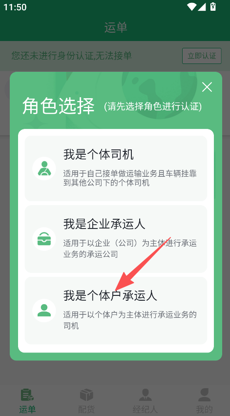 1、打开软件,选择角色(如个体户承运人),完成身份认证。