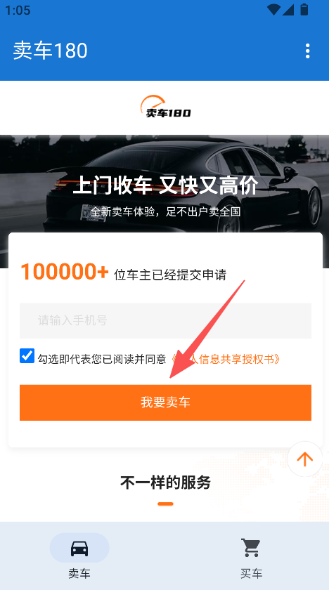 1、打开软件,点击我要卖车,进入卖车申请流程。