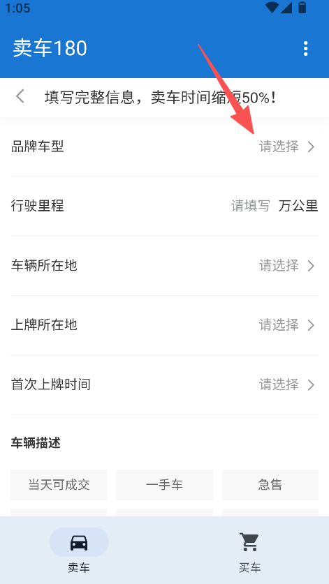 2、填写品牌车型、行驶里程等车辆信息,完善卖车资料。