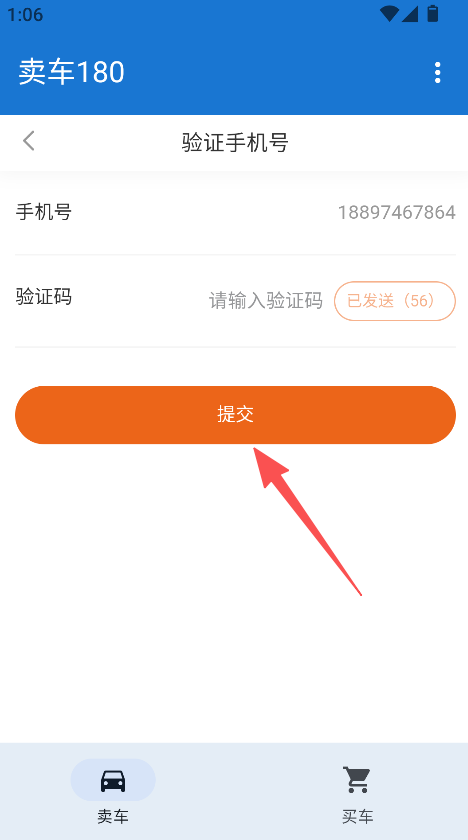 3、验证手机号,输入验证码后提交,完成卖车申请。