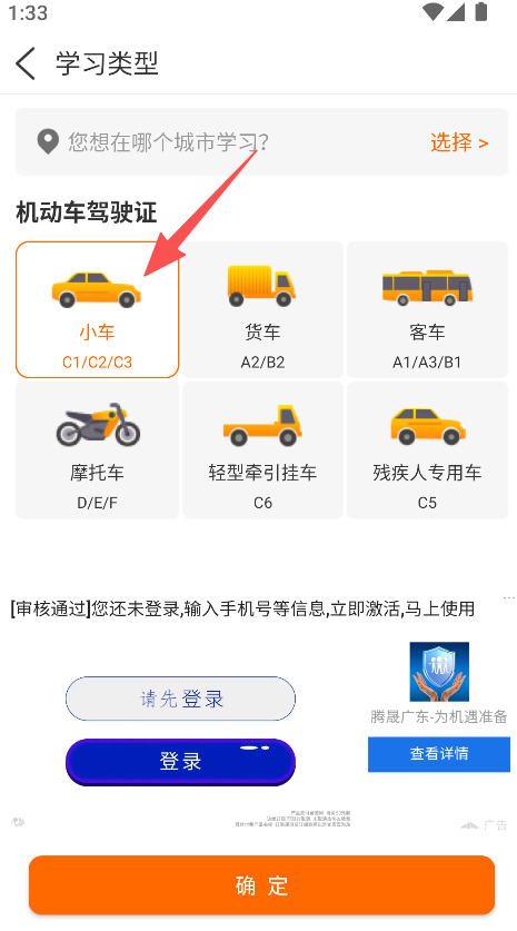 1、打开软件,选择学习类型(如小车),选择城市(如成都)。