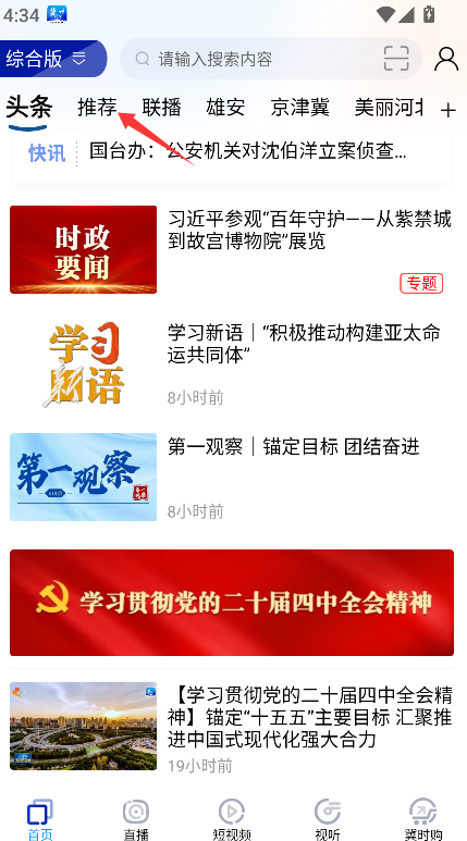 1、找到并点击“推荐”栏目入口,页面将跳转至编辑推荐的新闻列表。