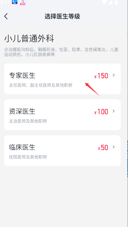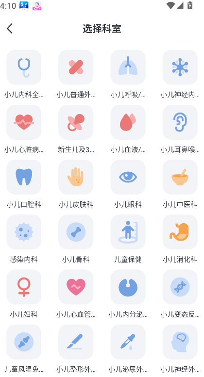2、根据孩子的情况或具体需求,浏览并选择相应的咨询类型或科室。
