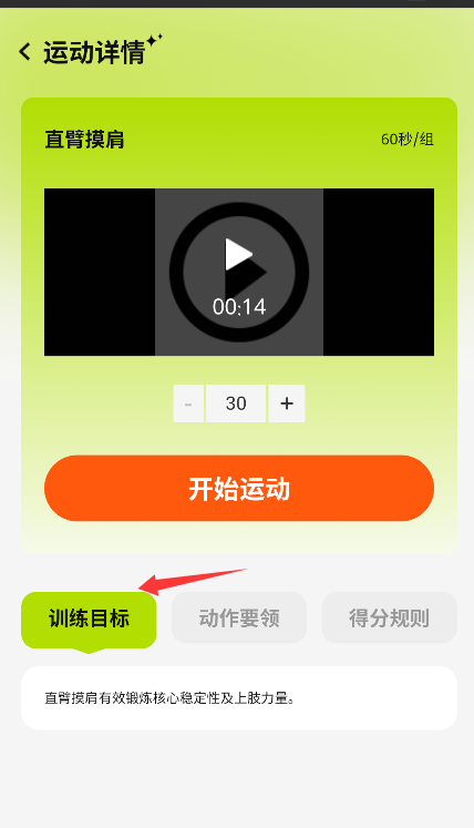 3、. 目标设定后,点击“开始运动”按钮即可启动训练,并跟随屏幕指引完成动作。