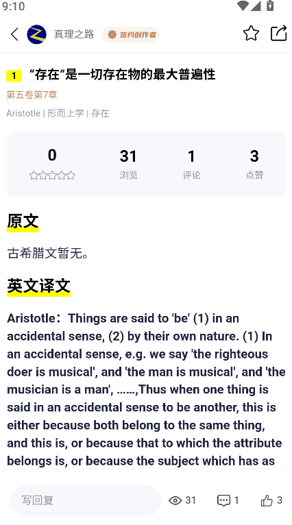 3、进入专题内容详情页面后,通常包含哲学经典的原文、中文译文以及相关解读信息。