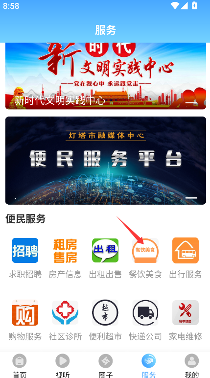 2、浏览各类生活服务板块,找到并点击“餐饮美食”分类入口,进入餐饮美食专题页面。