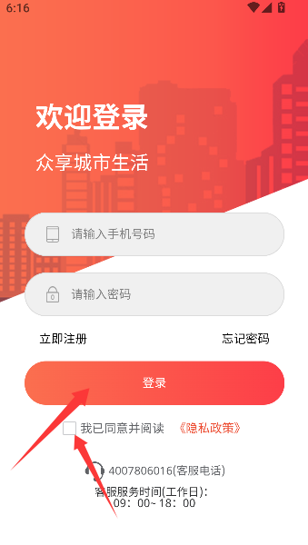 3、最后务必备忘录式地勾选同意隐私政策条款,再坚定点击登录,正式开启城市生活探索之旅。