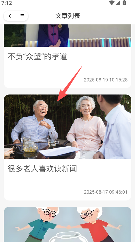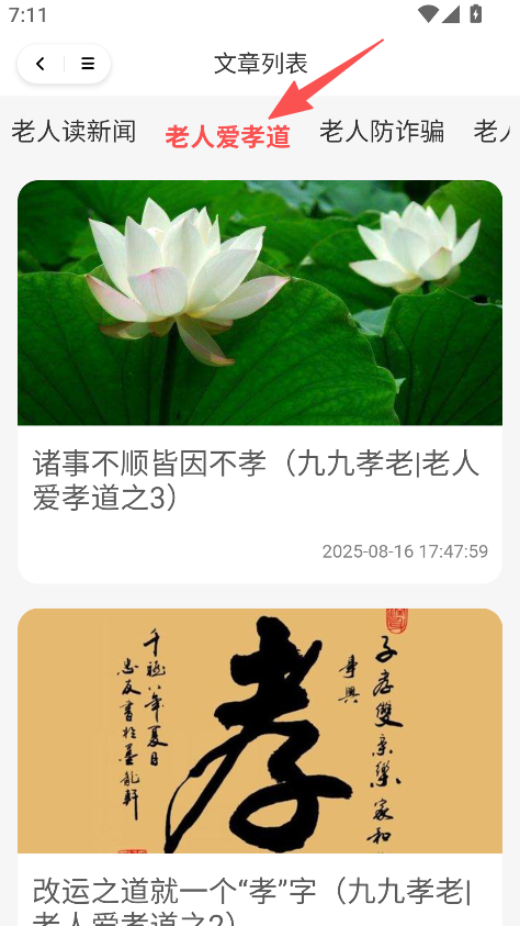 1、打开软件,选择老人爱孝道栏目,进入文章列表。
