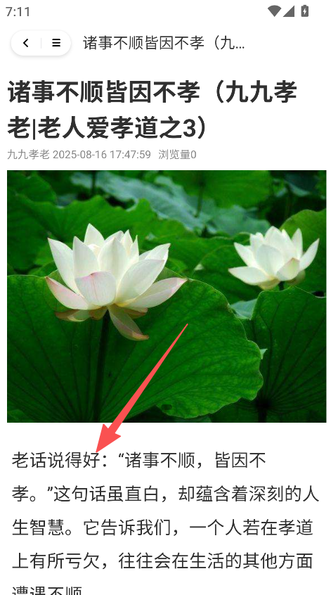 2、点击孝道文章(如《诸事不顺皆因不孝》),阅读文章内容。
