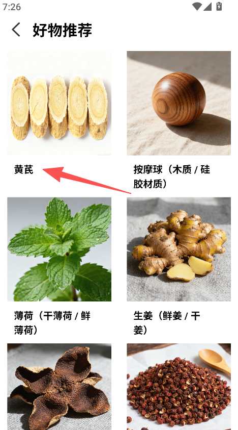 1、具备好物推荐功能,展示黄芪、薄荷等养生品,用户了解养生好物,选择适合的保健用品。