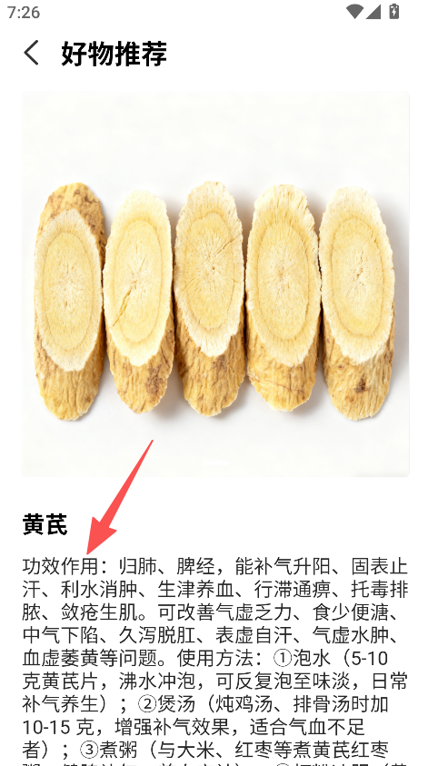 2、好物信息详实,黄芪等养生品功效、使用方法说明详细,用户了解养生好物全面,养生决策有据。