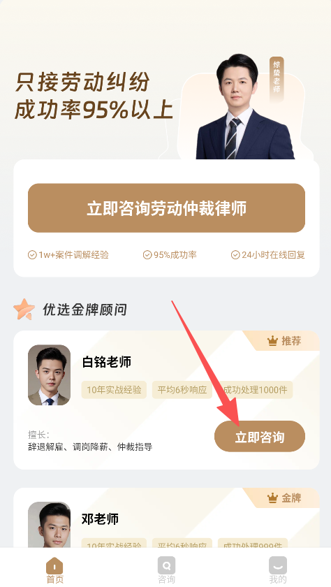 1、提供律师咨询功能,优选劳动仲裁律师在线服务,用户可咨询劳动纠纷问题,获取专业建议。