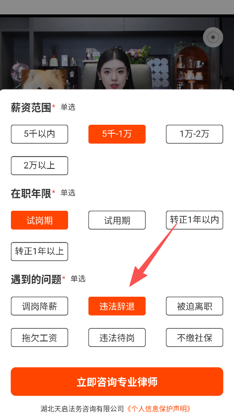 2、支持信息填报功能,填写薪资、在职年限、纠纷类型,律师精准了解情况,提升咨询效率。