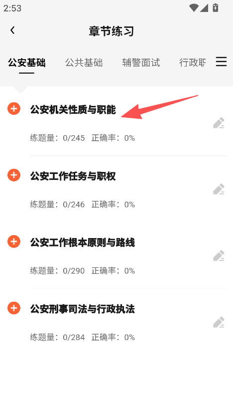 2、选择章节(如公安机关性质与职能),进入答题界面。
