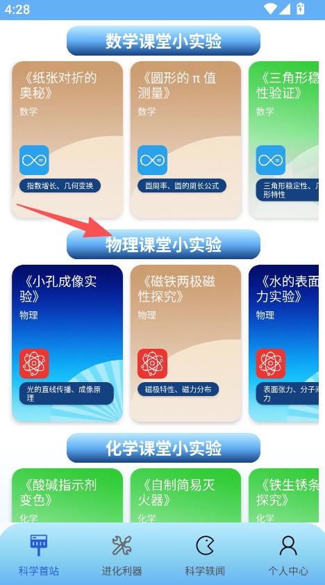 《科学的进化》是一款科学科普与实验学习软件,提供数学、物理、化学课堂小实验(如《水的表面张力实验》),还有科学小故事(如苹果落地的启发),覆盖多学科知识;助力用户通过实验与故事学习科学,是科学知识科普与学习的实用工具。