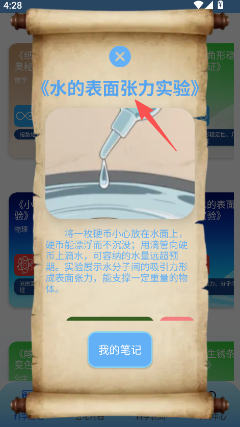 2、查看实验详情(如硬币漂浮原理),学习科学知识。
