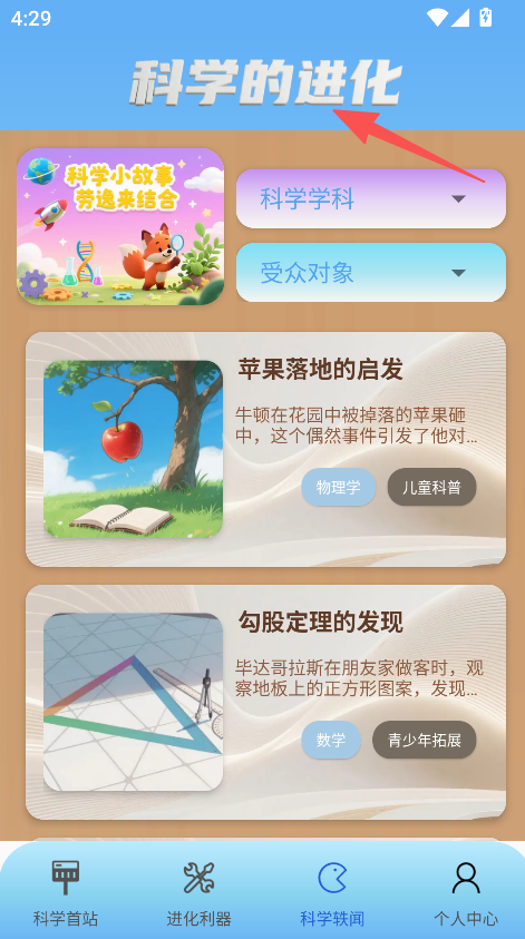 3、点击进化利器,选择科学学科与受众,查看科学小故事(如苹果落地的启发)。
