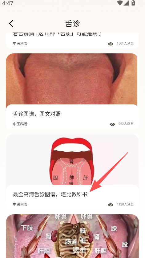 2、选择舌象图谱(如最全高清舌诊图谱),进入分类页。