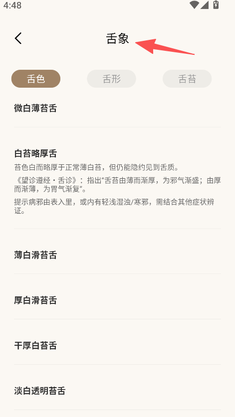 3、查看舌象分类(如舌色、舌形),学习舌诊知识。