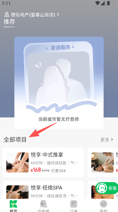 1、打开软件,进入全部项目,选择服务(如悦享・中式推拿)。