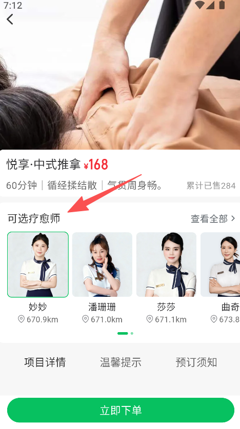 2、进入项目详情,选择可选疗愈师(如妙妙)。