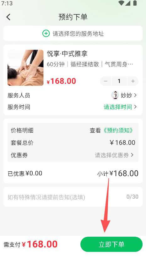 3、进入预约下单,选择服务地址、时间,点击立即下单。