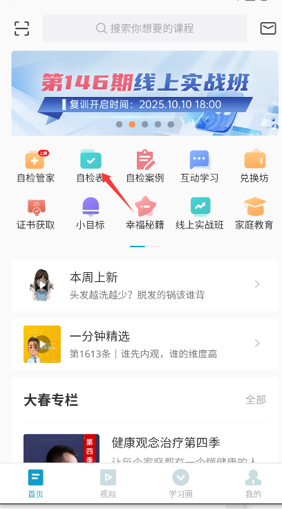 1、找到并点击“自检表”功能入口,即可进入健康自我检测模块。