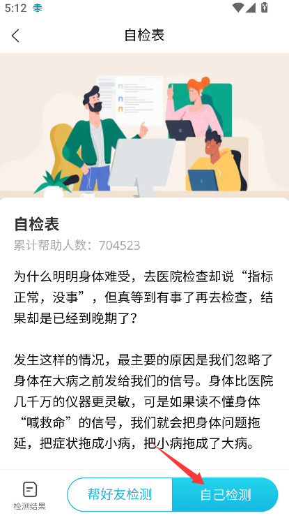 2、点击“自己检测”按钮开始进行健康状况评估,根据提示完成答题或信息填写。