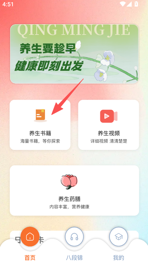 3、板块分类清晰,养生书籍、视频等板块入口明确,养生学习路径清晰,用户快速找到所需内容。