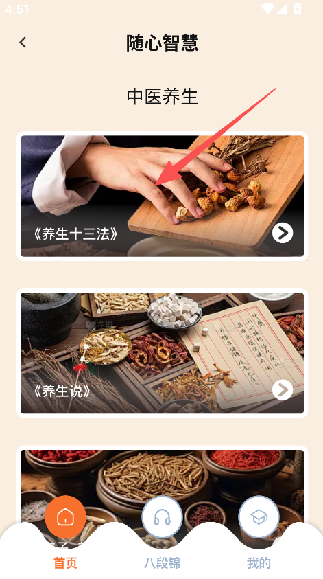 《随心智慧》是一款中医养生软件,设有养生书籍、养生视频、养生药膳等板块。用户可点击养生书籍,进入中医养生板块学习《养生十三法》等内容,了解发宜常梳、目宜常运等具体养生方法;还能通过视频、药膳板块获取多样养生资源,从书籍、视频、药膳多维度学习中医养生知识,开启科学养生之旅。