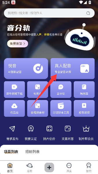 1、在软件中找到并点击“真人配音”入口,即可进入一个由众多专业配音者组成的音库。