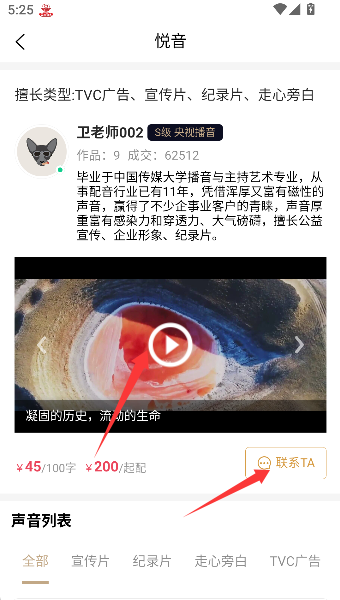3、点击播放键可试听配音小样,若效果满意,即可通过“联系TA”按钮直接建立沟通渠道。