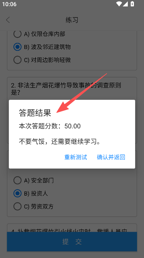 2、支持答题结果功能,提交后显示分数,考生了解学习情况,为安全生产备考调整学习策略。