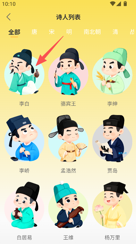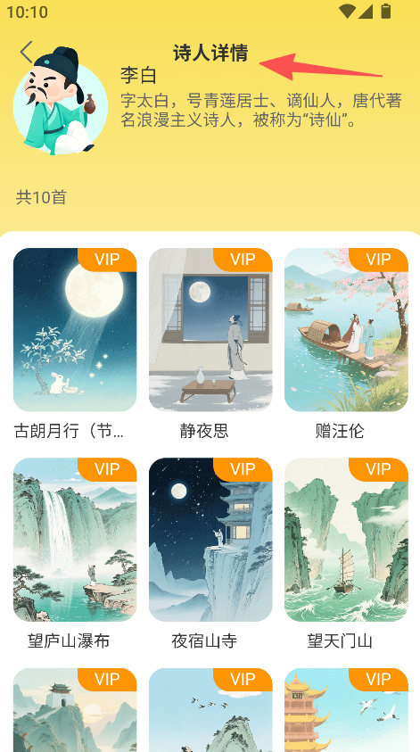 3、在诗人详情页,查看诗人介绍与对应古诗,开展古诗学习。