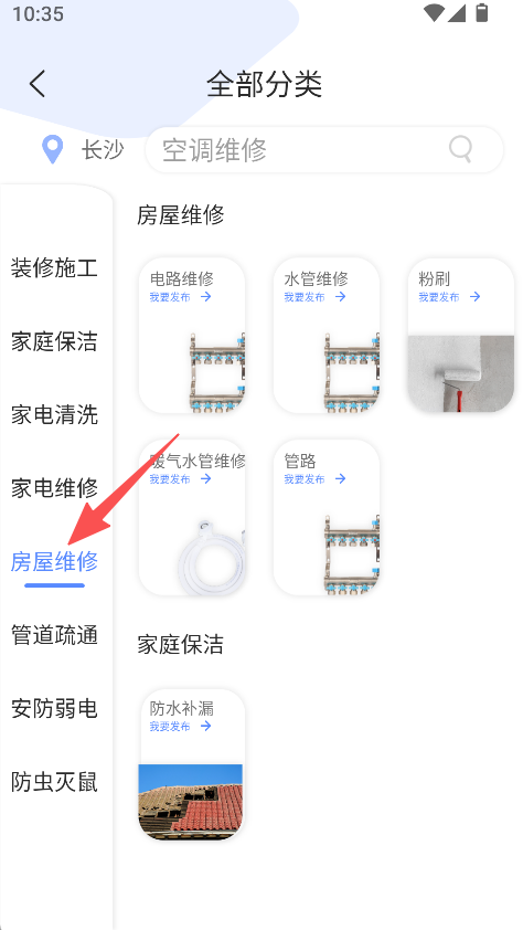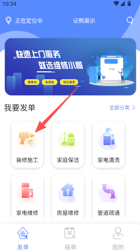 1、进入发单板块,选择装修施工、房屋维修等服务分类。