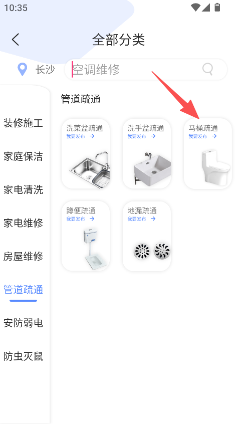 2、进入全部分类,选择具体服务类型(如房屋维修的电路维修、管道疏通的马桶疏通)。