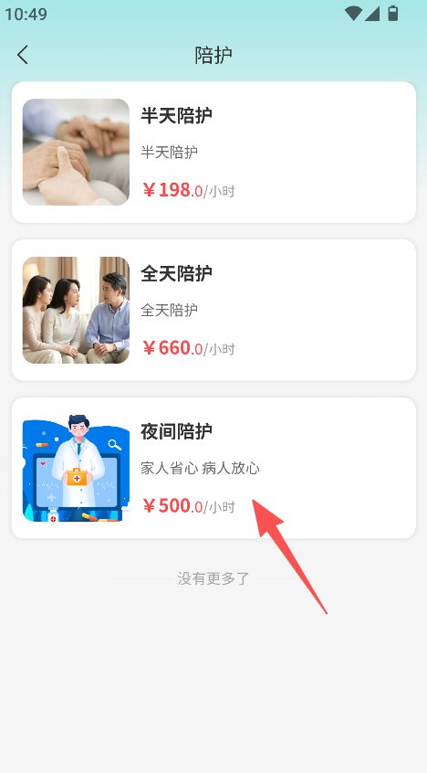 1、进入首页,选择专业陪护服务,查看半天、全天、夜间陪护类型。