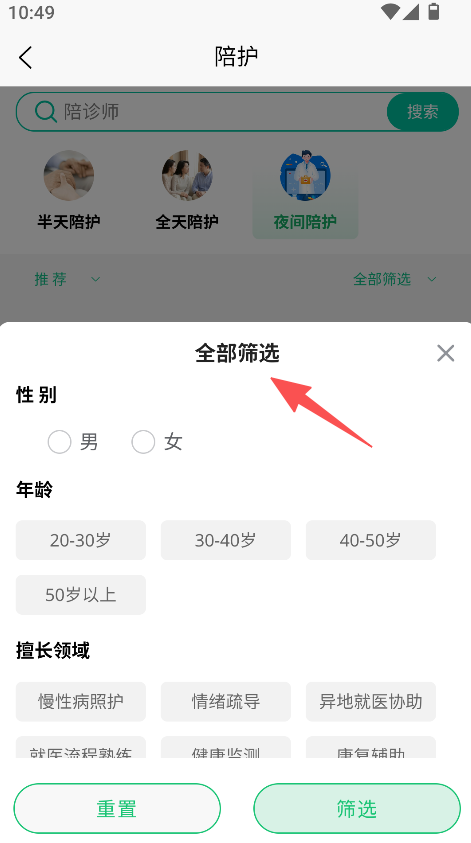 2、进入全部筛选,选择性别、年龄、擅长领域,精准匹配陪护人员。