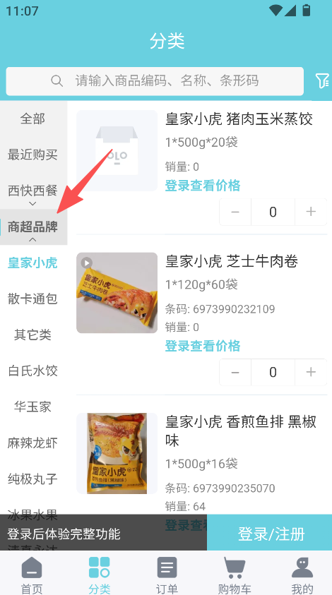 2、进入商超品牌,选择皇家小虎品牌,查看芝士牛肉卷等冻品。
