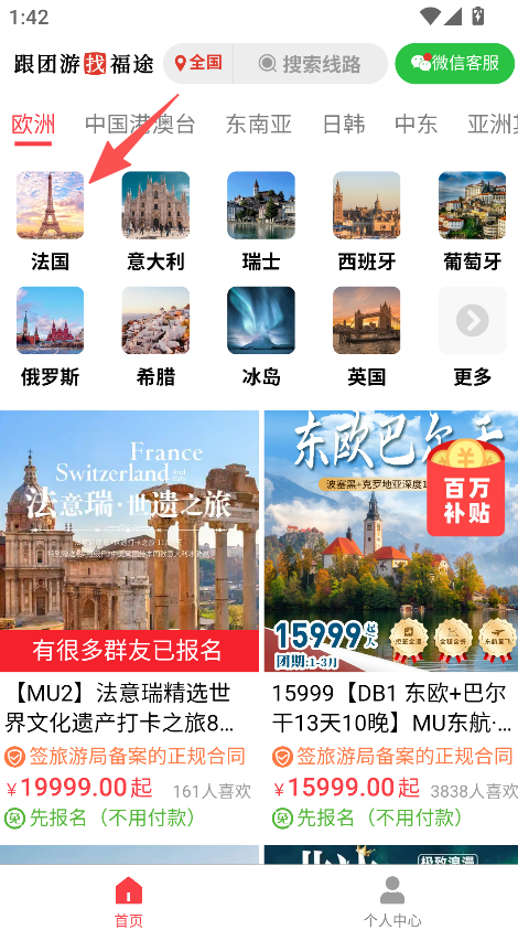 1、具备目的地选择功能,用户选择法国、意大利等多国目的地,快速筛选线路,旅行方向明确。