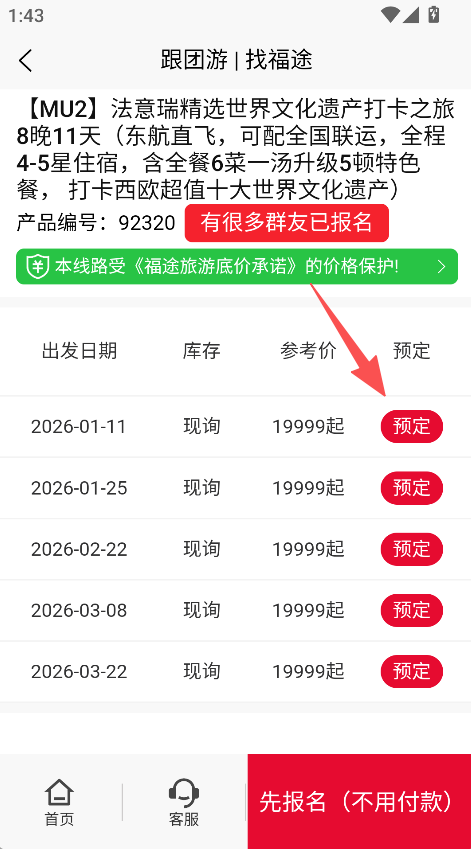 2、服务保障明确,线路受价格保护,还有先报名不付款机制,用户出行有保障,报名无压力。